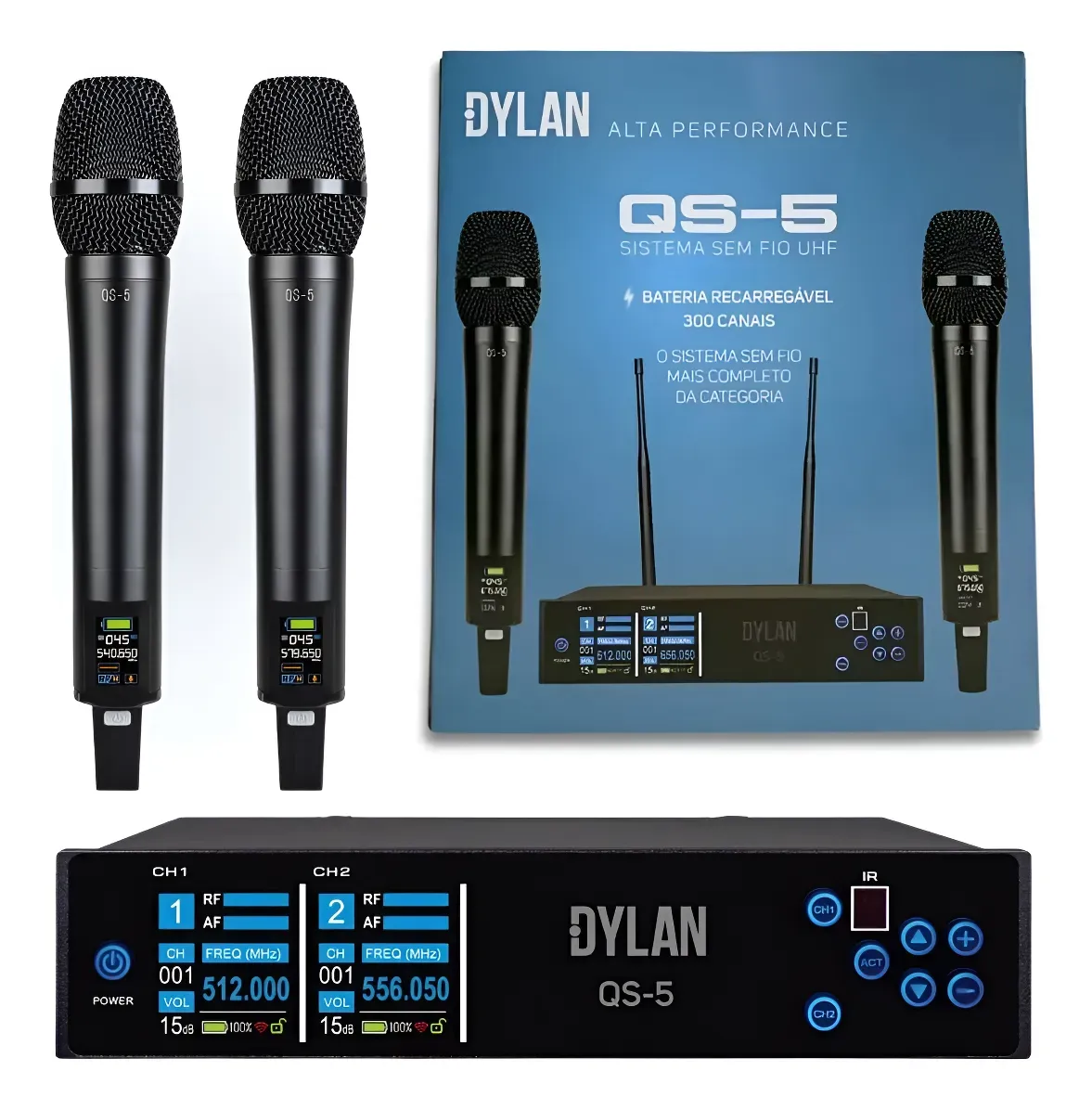 O QS-5 e um sistema sem fio com recursos exclusivos e inovadores que revolucionam a performance. Construido inteiramente em aluminio (bastao e base), possui bateria recarregavel de 3,7V, visor LCD colorido com funcao gyroscope, scan automatico de frequencia, sincronismo via infravermelho, 6 presets de EQ, controle de ganho, botao mute e exclusiva capsula dinamica cardioide destacavel.