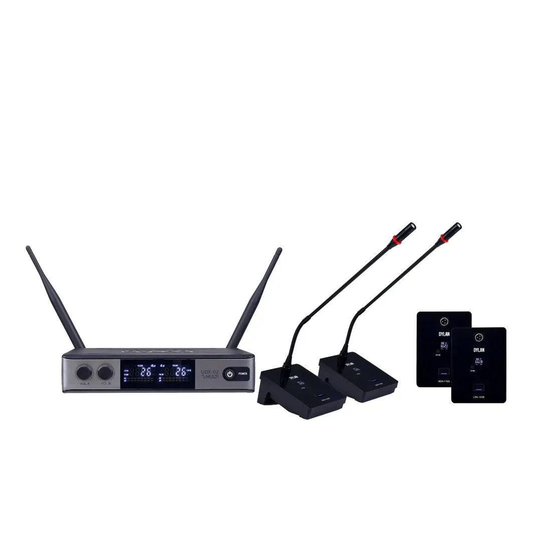Design de Mesa: Microfones gooseneck oferecem captacao discreta e elegante, ideal para ambientes onde estetica e importante. Base transmissora integrada elimina necessidade de cabos visiveis.